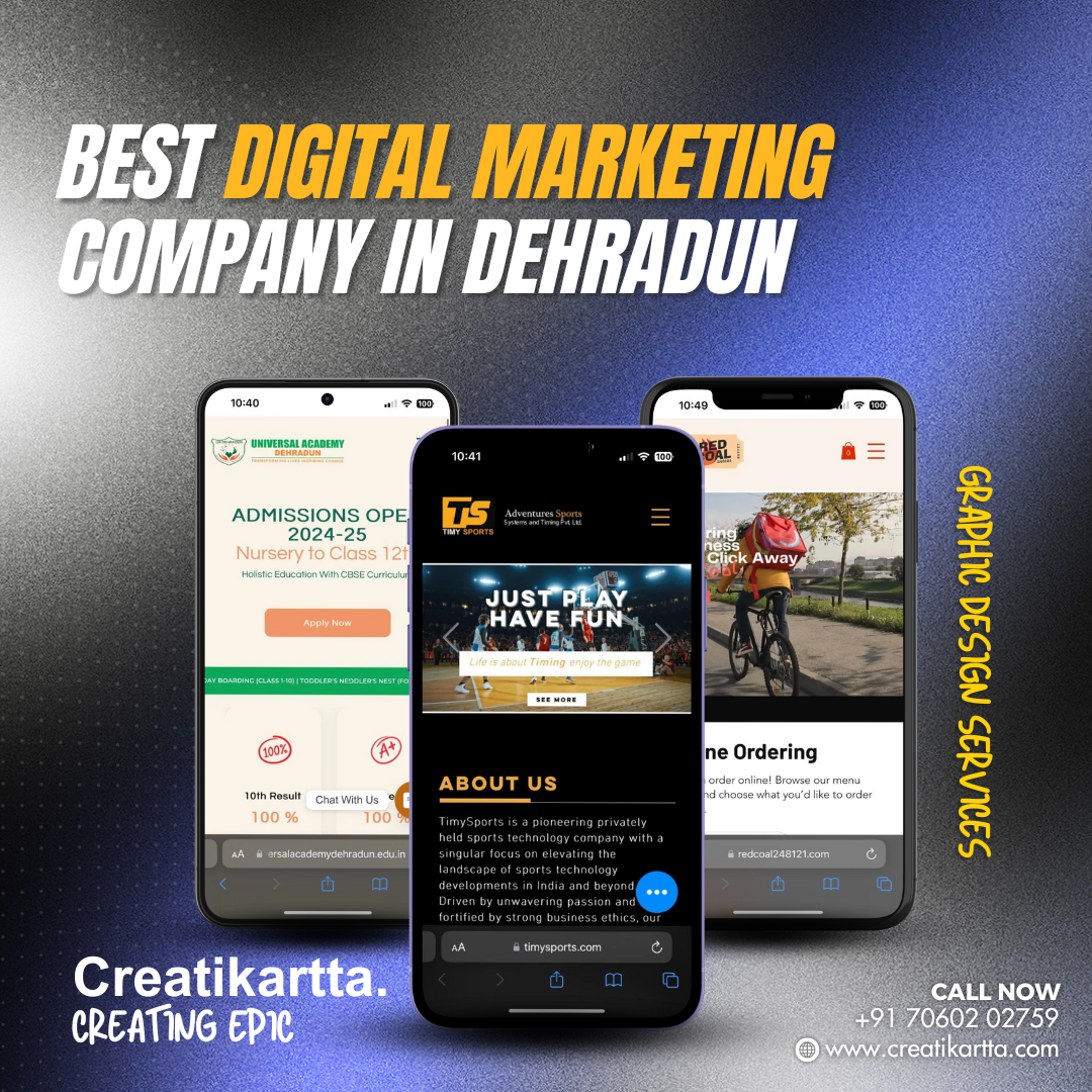 Creatikartta is a leading digital marketing agency in Dehradun, helping businesses grow online with data-driven strategies and creative solutions. We specialize in SEO services, Google Ads, Meta (Facebook & Instagram) Ads, website design and development, social media marketing, content creation, and brand strategy. Our team focuses on increasing your online visibility, generating quality leads, and improving brand engagement. Whether you’re a startup or an established brand, Creatikartta offers customized digital solutions to help you achieve measurable results. Partner with us to boost your online presence and take your business to the next level with proven marketing strategies that work.